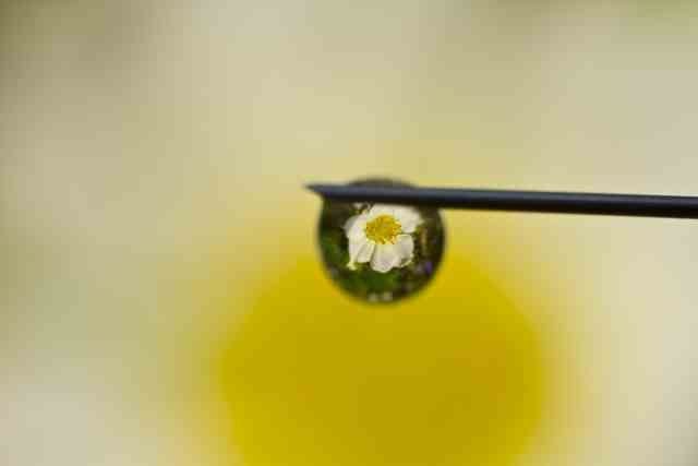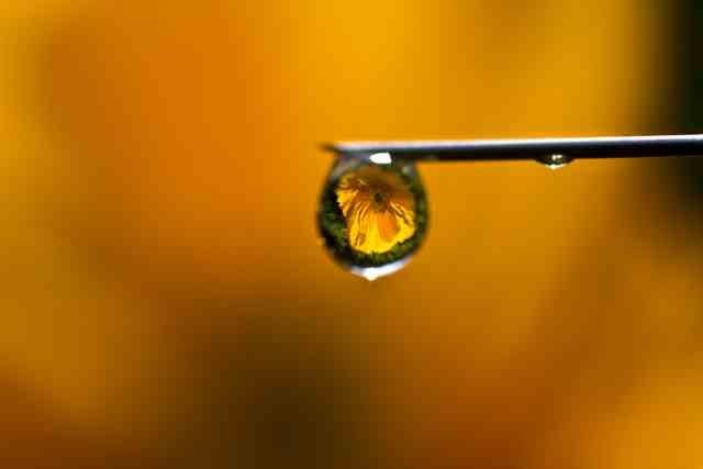 Een druppel aan een injectienaald vlak voor een bloem zodat deze door de bolling van de druppel helemaal zichtbaar is en een prachtige kleur op de achtergrond creëert.